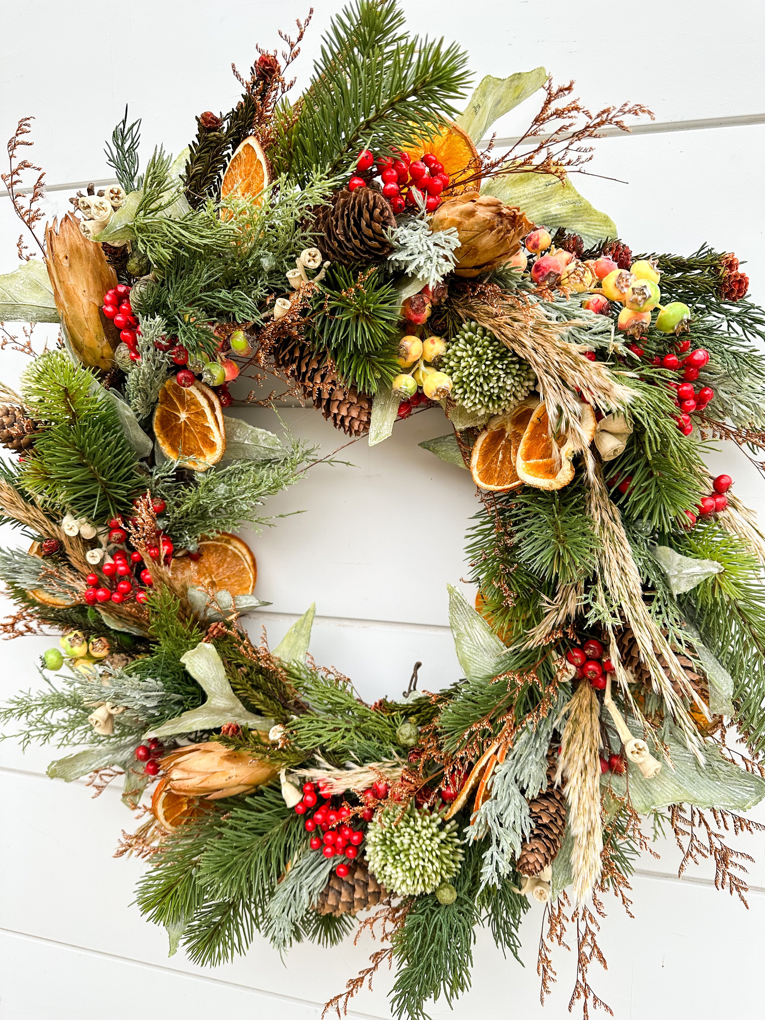 This wreath has the perfect combo of my two best and most realistic pine stems. The evergreen is paired with artificial black and white matte berries, ivory ferns, and magnolia leaves. I brought in some natural elements with the real pine cones and real bell pods. The design all comes together beautifully around a large gold metal star.